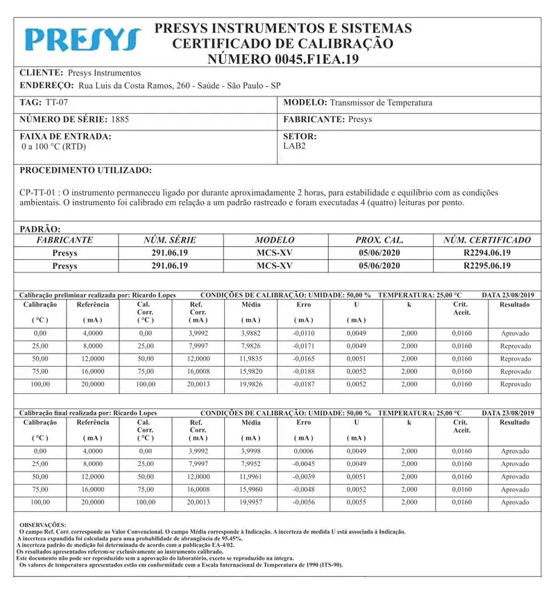 No documento do prestador de serviço consta o número do certificado, nome do cliente, logotipo carregado na opção de tarefa, informações do TAG, modelo, fabricante e informação do procedimento utilizado. Os dados de calibração do padrão para fazer o cálculo da incerteza combinada já aparecerão, assim como o número de série.
