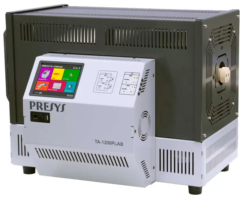 The TA-1200PLAB Calibrator generates temperature values in the block or insert from 50 to 1200 °C. Its high accuracy and homogeneity is due to the fact that TA-1200PLAB has three control zones, allowing better distribution of temperature throughout the block and ensuring a better radial and axial uniformity through the extension of the 100 mm of measurement zone. It has two inputs for mV and for various thermocouples types, including Au-Pt, with deviation function configurable. It is available in two mounting versions: horizontal and vertical. TA-1200PLAB incorporates concepts of automatic calibration with calibration management softwares, especially with the Isoplan® Software, such as issuing reports and certificates, task management, calibration data organization and archiving etc.